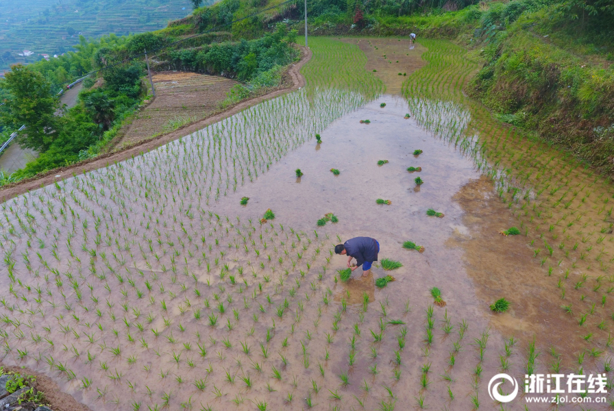 武義縣新宅鎮(zhèn)大萊村一農(nóng)戶在梯田上手工插種單季稻。