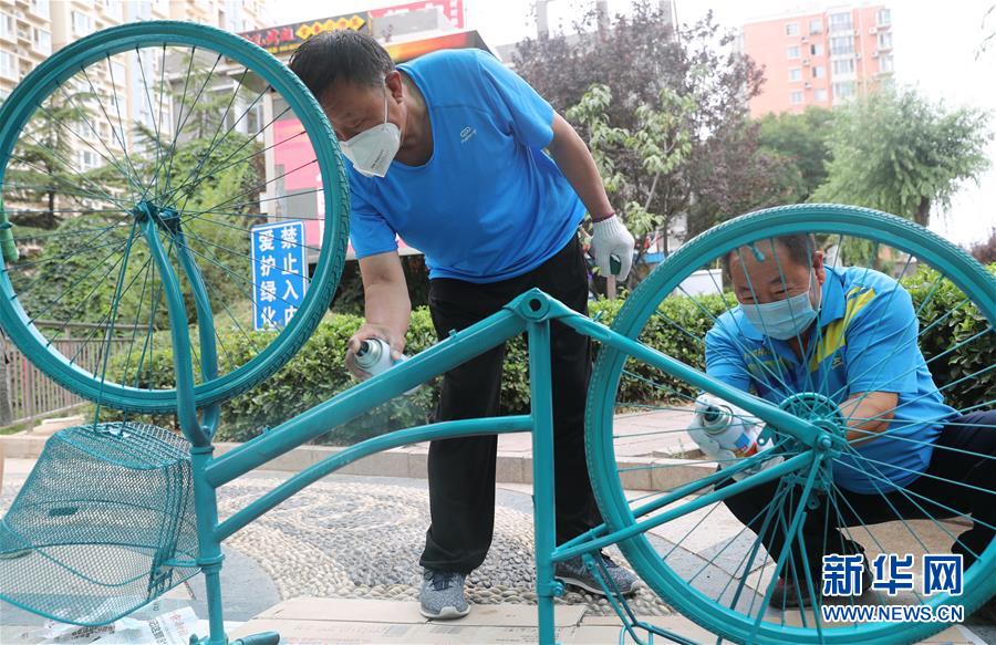 當(dāng)日,北京市豐臺區(qū)花鄉(xiāng)天倫錦城社區(qū)的居民利用社區(qū)內(nèi)廢棄的自行車,進行噴漆、裝上花籃等改造,把這些廢舊自行車變成裝飾品,自己動手裝點社區(qū)環(huán)境。