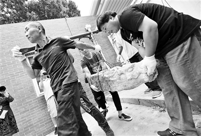 在昨天的文物搬運(yùn)現(xiàn)場,兩位工人挑擔(dān)子,兩位工人用手托住龍頭兩邊,四人費(fèi)了好大勁才將螭頭搬到車上,開啟“回家”之路。待螭頭到達(dá)圓明園后,將有專家對它們進(jìn)行全身“體檢”,制定修復(fù)方案。“這些螭頭有一些小裂縫,如果不好好保護(hù),時(shí)間久了容易出問題。”圓明園文物考古科科長陳輝說。(記者 李夢婷)