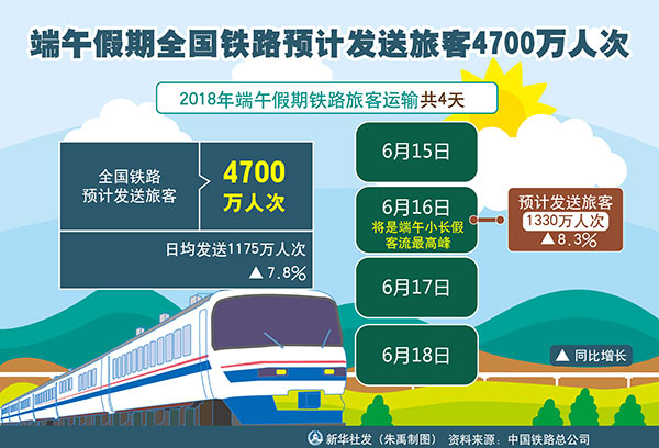新華社北京6月13日電(記者樊曦)記者13日從中國鐵路總公司獲悉,為期4天的2018年端午假期鐵路旅客運輸將于6月15日啟動,全國鐵路預(yù)計發(fā)送旅客4700萬人次。