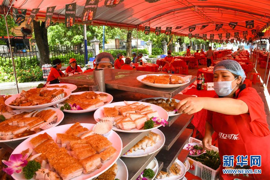 6月14日,工作人員在廣州天河區珠村七夕廣場準備龍舟飯。當日,廣州市天河區舉行一場熱鬧歡快的龍舟活動,來自多個村莊“走親戚”的龍舟隊參加。按廣州的傳統習俗,每年農歷五月初一至初五,各村的龍舟隊要到周圍村落“走親戚”。走親戚的龍舟隊到來時,受訪村子要準備好龍舟飯招待來客。活動當天,鳴炮敲鑼,一派喜慶氣氛。新華社記者 鄧華 攝