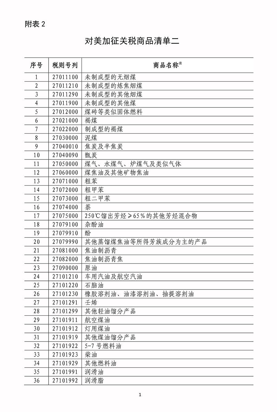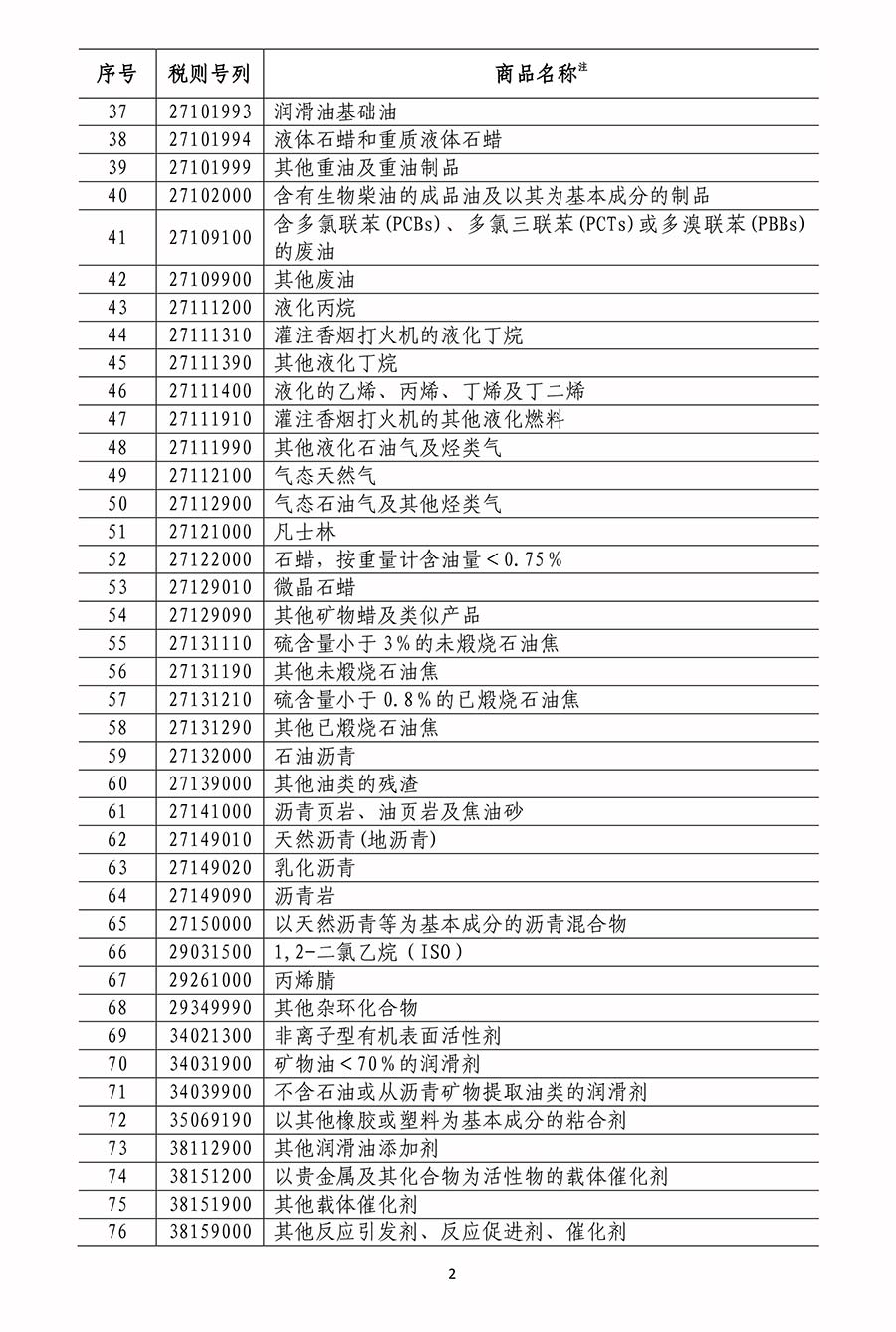 二、對(duì)化工品、醫(yī)療設(shè)備、能源產(chǎn)品等114項(xiàng)商品,加征關(guān)稅實(shí)施時(shí)間另行公告,具體商品范圍見(jiàn)附表2。