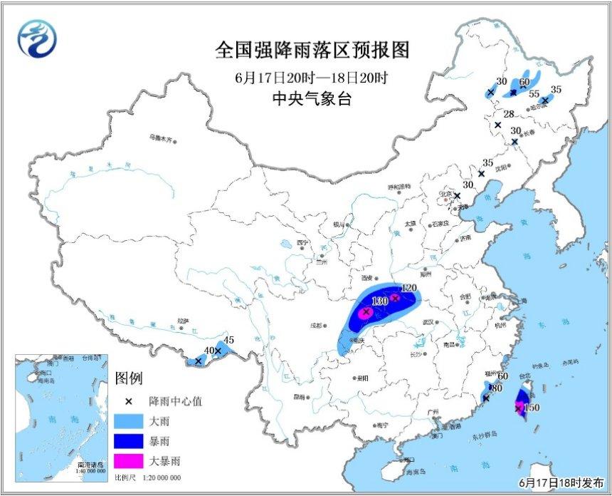 17日20時至18日20時,陜西東南部、四川東北部、重慶西部和北部、河南西南部、湖北西北部等地有大到暴雨,其中,四川東北部、湖北西北部等地局地有大暴雨(100~130毫米);上述部分地區伴有短時強降水(小時最大降水量20~50毫米,局地60毫米以上),局地有雷暴大風。另外,東北地區、華北北部有分散性大雨或暴雨,局地伴有雷暴大風或冰雹;福建沿海、臺灣島有大到暴雨,局地有大暴雨。