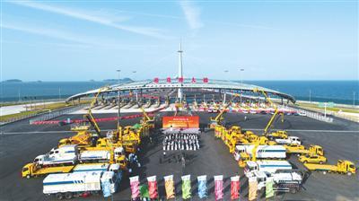 港珠澳大橋主體工程首批45輛拯救及養(yǎng)護設備近期正式交付使用,這批設備包括洗掃車、隨車吊、防撞車等。 新華社記者 梁 旭攝
