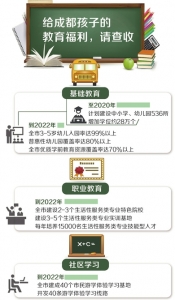 在增加教育公共服務供給方面,成都市全面實施中心城區中小學、幼兒園“三年攻堅”行動計劃,至2020年計劃建設中小學、幼兒園536所,增加學位約28萬個,滿足市民公共教育服務需求。進一步擴大學前教育資源總量,鼓勵扶持普惠性幼兒園。到2022年,全市3-5歲幼兒入園率達99%以上,普惠性幼兒園覆蓋率(公辦幼兒園和普惠性民辦幼兒園在園幼兒數占在園幼兒總數的比例)達80%以上,全市優質學前教育資源覆蓋率(二級園以上在園幼兒數占在園幼兒總數的比例)達70%以上。