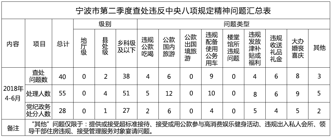 2018年4至6月,寧波市各級紀檢監(jiān)察機關共查處違反中央八項規(guī)定精神問題40起,處理55人,其中給予黨紀政務處分28人。