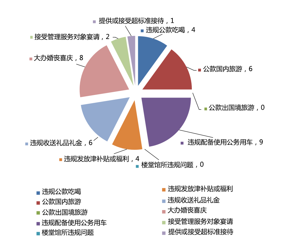 從查處問題類型看,違規(guī)問題數(shù)量較多的分別是違規(guī)配備使用公務用車問題(9起)、大辦婚喪喜慶問題(8起),公款國內(nèi)旅游問題(6起)、違規(guī)收送禮品禮金問題(6起),這四類問題占查處總數(shù)的72.5%;從處理干部級別看,查處縣處級干部4人,占7.3%;鄉(xiāng)科級及以下干部51人,占92.7%。(寧波市紀委監(jiān)委)