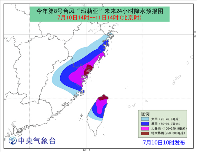 降水預報:10日14時至11日14時,浙江東部和南部、福建中北部、臺灣島中北部有大雨或暴雨,其中,福建東北部、浙江東南部、臺灣島北部等地的部分地區(qū)有大暴雨、局地特大暴雨(250-300毫米)。