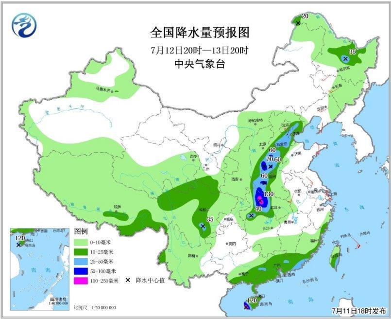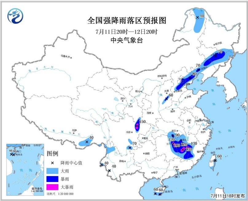 預(yù)計(jì)7月11日20時(shí)至12日20時(shí),福建西部、江西、湖南東部、湖北東南部、四川盆地西北部和南部、山西中部、河北中部和東北部、北京東南部、天津中北部、遼寧西部和北部、吉林中東部以及海南島南部、云南西部等地有大雨或暴雨,其中,江西中部、湖南東北部、四川盆地西北部等地的局部地區(qū)有大暴雨(100~180毫米);上述地區(qū)最大小時(shí)降水量30~50毫米,局地60毫米以上(見圖1)。中央氣象臺(tái)7月11日18時(shí)繼續(xù)發(fā)布暴雨黃色預(yù)警。