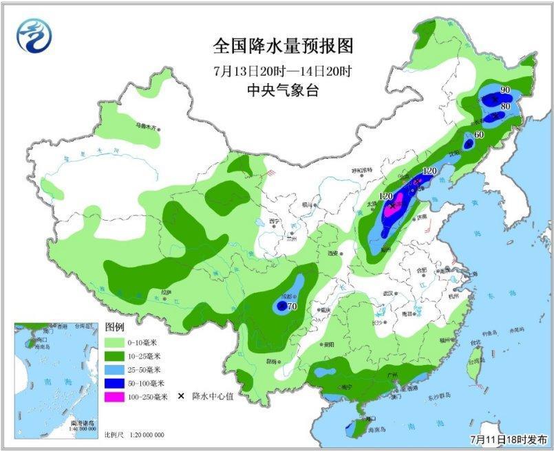 7月13日20時(shí)至14日20時(shí),東北地區(qū)中南部、華北中東部、黃淮西北部、四川盆地西部等地有大到暴雨,局部有大暴雨(100~120毫米);上述局部地區(qū)將伴有短時(shí)強(qiáng)降水等強(qiáng)對(duì)流天氣(見圖4)。