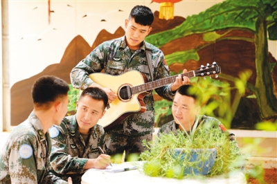 在聯合國馬里多層面綜合穩定團東戰區超級營地中國維和營內,有一支由中國第5批赴馬里維和部隊組成的“藍音樂隊”。“藍音樂隊”成員個個都是任務一線的骨干力量,經歷過生死考驗之后,更加懂得生命的意義。圖為2018年5月12日,“藍音樂隊”成員交流歌曲心得。韓立建攝(新華社發)