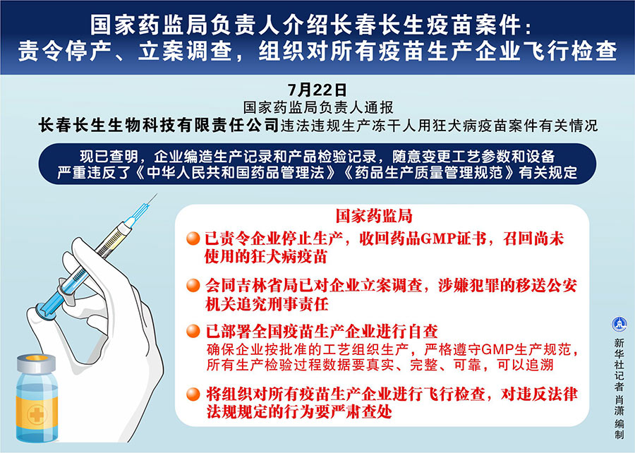 新華社北京7月22日電(記者齊中熙、趙文君)國家藥監局負責人22日通報長春長生生物科技有限責任公司違法違規生產凍干人用狂犬病疫苗案件有關情況。這位負責人說,國家藥監局已責令企業停止生產,收回藥品GMP證書,同時會同吉林省局已對企業立案調查,涉嫌犯罪的移送公安機關追究刑事責任。國家藥監局將組織對所有疫苗生產企業進行飛行檢查,對違反法律法規規定的行為要嚴肅查處。