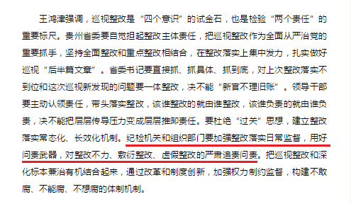 “中央巡視工作領(lǐng)導(dǎo)小組成員楊曉超主持召開向山西省委書記駱惠寧的反饋會(huì)議”“中央巡視工作領(lǐng)導(dǎo)小組成員姜信治主持召開向江蘇省委書記婁勤儉的反饋會(huì)議” “中央巡視工作領(lǐng)導(dǎo)小組成員王鴻津主持召開向湖南省委書記杜家毫的反饋會(huì)議”……中央紀(jì)委國家監(jiān)委網(wǎng)站公布的巡視反饋情況顯示,中央巡視工作領(lǐng)導(dǎo)小組副組長和成員分赴各被巡視地方和單位,主持召開了向其黨組織負(fù)責(zé)人的反饋會(huì)議,出席了向其領(lǐng)導(dǎo)班子反饋常規(guī)巡視情況會(huì)議,并對他們抓好巡視整改工作提出了要求。首次實(shí)現(xiàn)所有巡視反饋會(huì)議均有中央巡視工作領(lǐng)導(dǎo)小組副組長或成員出席,這體現(xiàn)了對做好巡視整改的愈加重視。