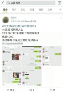 各大直播平臺上土豪也非常多,動(dòng)不動(dòng)就幾萬幾十萬地打賞。這些給了愛美且渴望鮮花和掌聲的女孩子一夜爆紅的不切實(shí)際的幻想。打開任意一個(gè)社交軟件,搜索“主播招聘”會立刻彈出上萬條信息,其中不乏“月入上萬不是夢”“管吃管住,不是巨丑就過”這樣極具吸引力的條件。