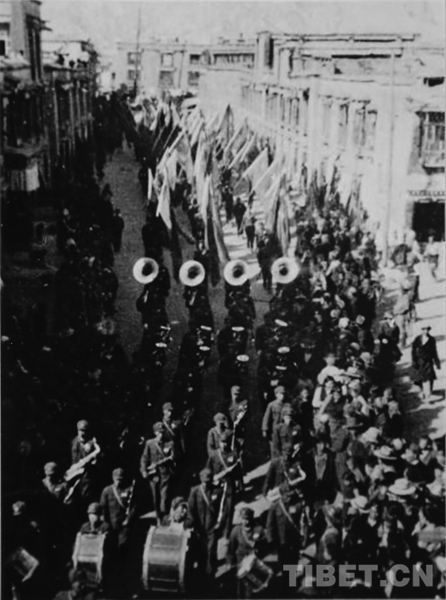 圖片為西藏文工團(tuán)老照片:十八軍到達(dá)拉薩。文工團(tuán)、軍樂(lè)隊(duì)參加入城式,行進(jìn)在八廓街。圖片由王勉之提供