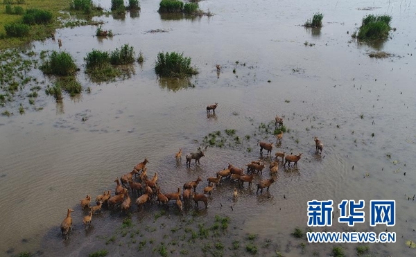 一群自然野化的麋鹿在湖南東洞庭國家級自然保護(hù)區(qū)內(nèi)活動(2017年5月10日無人機(jī)拍攝)。 新華社記者 李尕 攝