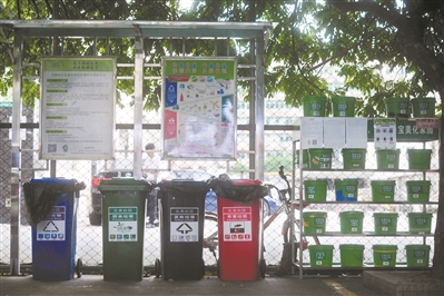 目前深圳已實施了小區(qū)垃圾分類1.0版和2.0版。深圳市城管局副巡視員楊雷介紹,1.0版是指分類設(shè)施已進入小區(qū),同時在小區(qū)定期開展資源回收日等活動。2.0版也就是“僑香村模式”,即是分類投放點在樓下集中設(shè)置,除此之外再無垃圾桶;每天垃圾投放的高峰時段,有志愿者在現(xiàn)場督導(dǎo)。