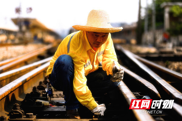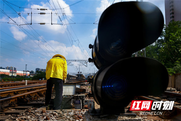 近日,記者跟隨長沙電務段工作人員一同進入長沙火車站站場,看到該段長沙信號車間的10余名信號工,頭戴草帽、手拿工具正在進行檢修作業?!拔覀児^主要是負責道岔‘病害’整治,工作強度大,上線作業5分鐘,工作服幾乎汗透?!?1歲的長沙東信號檢修工區工長董文海說道。