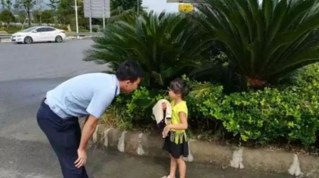公路上車來車往,5歲的小女孩獨自行走在路邊。8月13日一大早,溫州市永嘉縣楓林派出所的民警戴柏清就遇到了這樣的一幕。