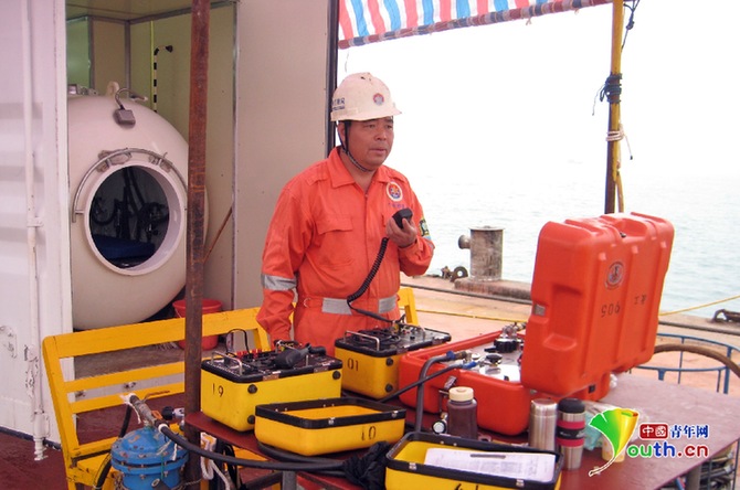 鐘海鋒正通過潛水電話指揮潛水員作業(yè)。詹欣金 攝