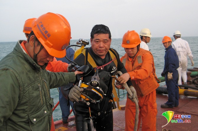 接到任務(wù),鐘海鋒立即組織廣州打撈局應(yīng)急分隊(duì)直奔出事地點(diǎn),進(jìn)行水下搜尋。11月28日下午,在經(jīng)過36個小時的連續(xù)搜尋后,一名潛水員發(fā)現(xiàn)沉船貨艙里還有6名幸存者。