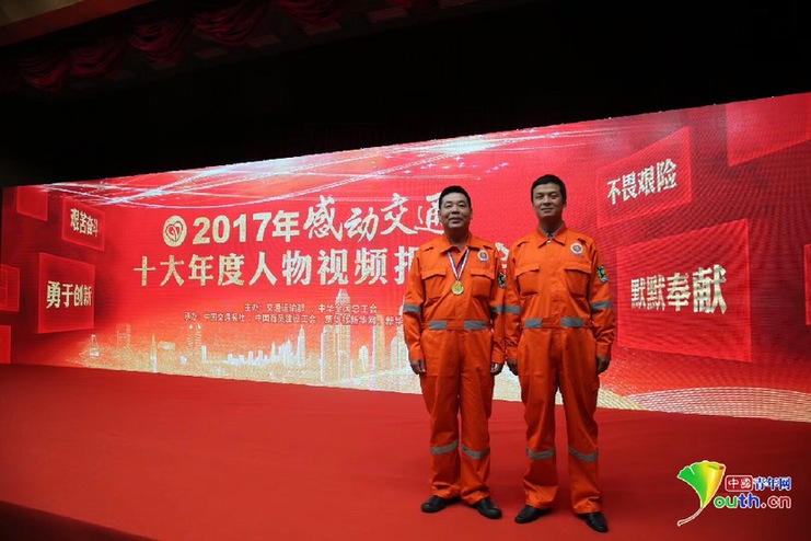 鐘海鋒(左)與鐘佛軍(右)在2017年感動交通十大年度人物頒獎現(xiàn)場。本人供圖