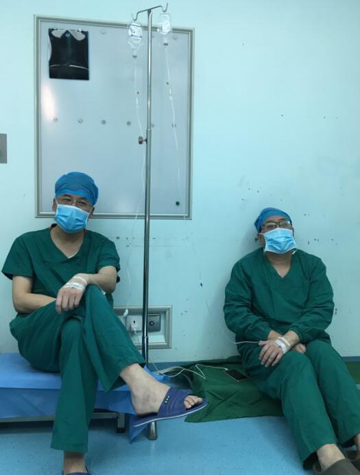 西安的兩位醫生蜷縮著靠在樓道里,