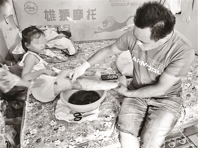 欣欣側身坐臥在床上,戴著塑膠手套的張志成正在為女兒換藥。右腿膝蓋后窩處的傷口面積很大,夏天化膿尤為嚴重,平常清洗創面、換藥這些事對張志成來說已經輕車熟路了。懂事的欣欣沒有哭鬧,也沒有喊疼。