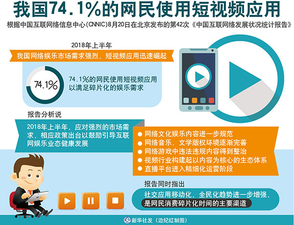 新華社北京8月20日電(記者施雨岑、王思北)根據(jù)中國互聯(lián)網(wǎng)絡(luò)信息中心(CNNIC)20日在京發(fā)布的第42次《中國互聯(lián)網(wǎng)絡(luò)發(fā)展?fàn)顩r統(tǒng)計(jì)報(bào)告》,2018年上半年,我國網(wǎng)絡(luò)娛樂市場需求強(qiáng)烈,短視頻應(yīng)用迅速崛起,74.1%的網(wǎng)民使用短視頻應(yīng)用,以滿足碎片化的娛樂需求。