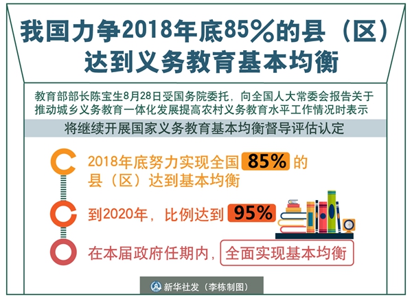 新華社北京8月28日電(記者胡浩)教育部部長陳寶生28日受國務院委托,向全國人大常委會報告關于推動城鄉(xiāng)義務教育一體化發(fā)展提高農村義務教育水平工作情況時表示,將繼續(xù)開展國家義務教育基本均衡督導評估認定,2018年底努力實現(xiàn)全國85%的縣(區(qū))達到基本均衡,到2020年,比例達到95%;在本屆政府任期內,全面實現(xiàn)基本均衡。