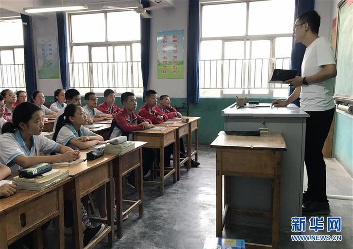 9月3日,壽光市田馬初中教師潘艷明(右)給學生們上新學期第一課。 當日是山東壽光市中小學校正式開學的第一天。壽光田馬初中的學生陸陸續續地背著書包、帶著被褥走進校園。受今年18號臺風“溫比亞”影響,壽光部分鄉鎮遭受洪澇災害,當地一些學校的院墻、操場等遭受洪水浸泡。在社會各界和全體老師家長的努力下,截至目前,壽光市所有的受災學校如期開學。 新華社記者 席敏 攝
