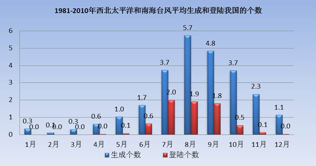 圖1 1981-2010年西北太平洋和南海臺風平均生成和登陸我國個數 李慧 制圖