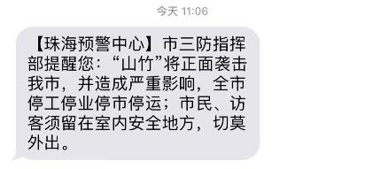 廣東珠海市民收到了來(lái)自珠海預(yù)警中心的短信:“切莫外出。”