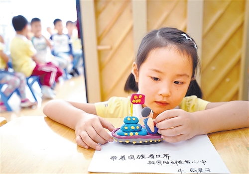 圖⑥ 9月30日,安徽省肥東縣實(shí)驗(yàn)幼兒園御景部開(kāi)展親子泥塑創(chuàng)意活動(dòng),孩子們用彩泥制作國(guó)旗慶佳節(jié)。許慶勇 攝