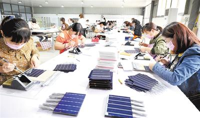 近日,魏縣德政鎮前小寨村扶貧微工廠工人正在檢驗太陽能板。魏縣立足留守婦女等半勞力多的實際,發展“扶貧微工廠”252家,帶動建檔立卡人口就業6000余人。 記者 杜柏樺攝
