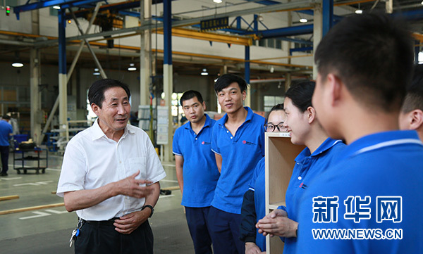 吳振祥(左)走進企業(yè)車間班組,與職工面對面交談(資料照片)。 新華社發(fā)