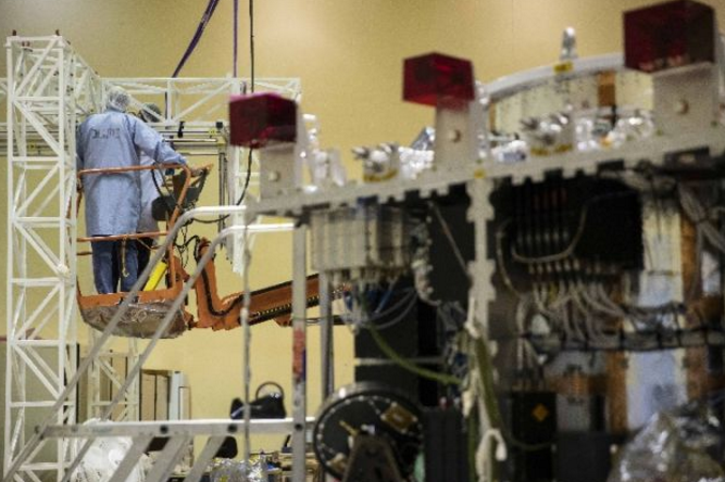 2018年8月31日,在位于巴西圣保羅州圣若澤杜斯坎普斯市的巴西國家空間研究所,工作人員在中巴地球資源04A衛星旁工作。新華社記者李明攝