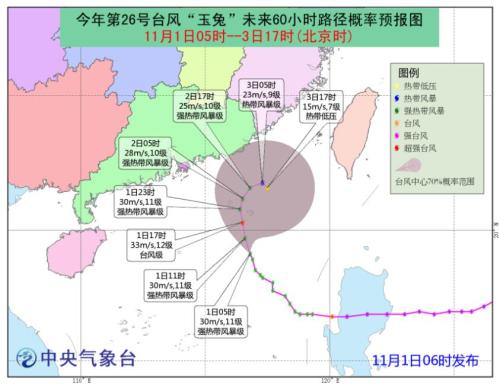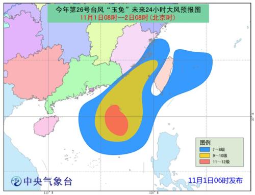 今年第26號臺風“玉兔”(強熱帶風暴級)的中心今天(1日)早晨5點鐘位于東沙島偏南方向約170公里的南海東北部海面上,中心附近最大風力11級(30米/秒),中心最低氣壓980百帕。