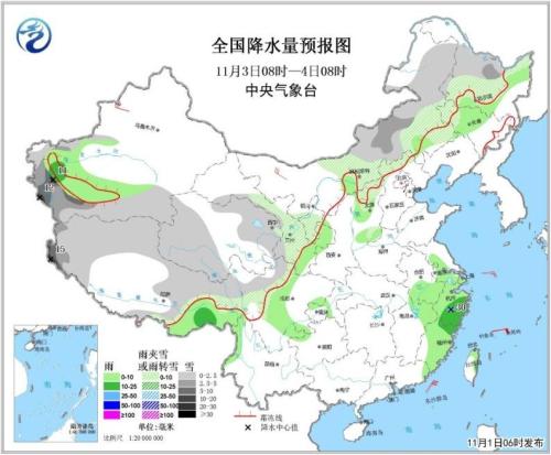 11月1日08時至2日08時,新疆北部和南疆西部山區等地部分地區有中到大雪或雨夾雪,局地有暴雪(10~15毫米)。江南東部、廣東中東部和臺灣島東北部等地的部分地區有中到大雨,其中,廣東東部、福建南部和臺灣等地局地有暴雨或大暴雨(100~110毫米)。新疆北部、南疆盆地、內蒙古西部和甘肅西部等地的部分地區有5~6級及以上風。臺灣海峽、南海東北部海域將有8~9級大風,陣風10~11級(見圖3)。