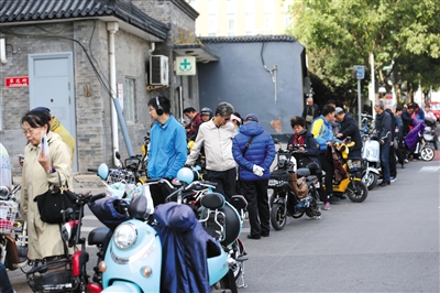 10月10日,新京報曾報道《新規(guī)實施在即 電動車扎堆上牌》,調(diào)查發(fā)現(xiàn),國慶長假過后,有不少市民“扎堆兒”前往交管部門的非機(jī)動車登記站為電動自行車上牌,在部分登記站領(lǐng)牌甚至需要排隊數(shù)小時。