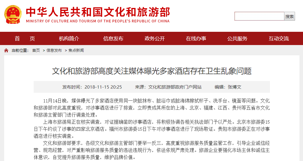 11月15日晚間,文化和旅游部對多家酒店被曝衛(wèi)生亂象作出回應(yīng)稱,已責(zé)成涉事酒店所在五省市文化和旅游主管部門調(diào)查處理。