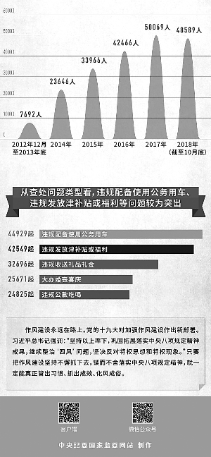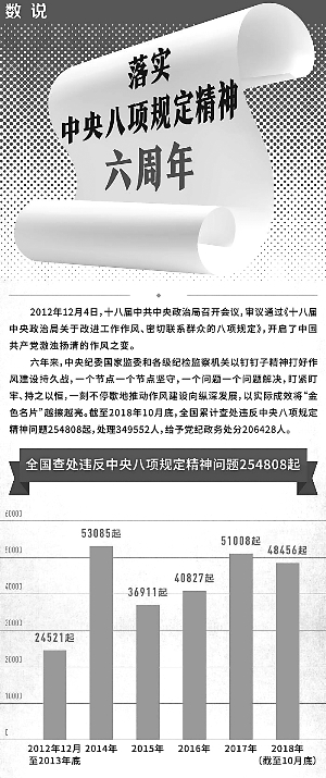 六年來,中央紀委國家監(jiān)委和各級紀檢監(jiān)察機關(guān)以釘釘子精神打好作風建設持久戰(zhàn),一個節(jié)點一個節(jié)點堅守,一個問題一個問題解決,盯緊盯牢、持之以恒,一刻不停歇地推動作風建設向縱深發(fā)展,以實際成效將“金色名片”越擦越亮。截至2018年10月底,全國累計查處違反中央八項規(guī)定精神問題254808起,處理349552人,給予黨紀政務處分206428人。