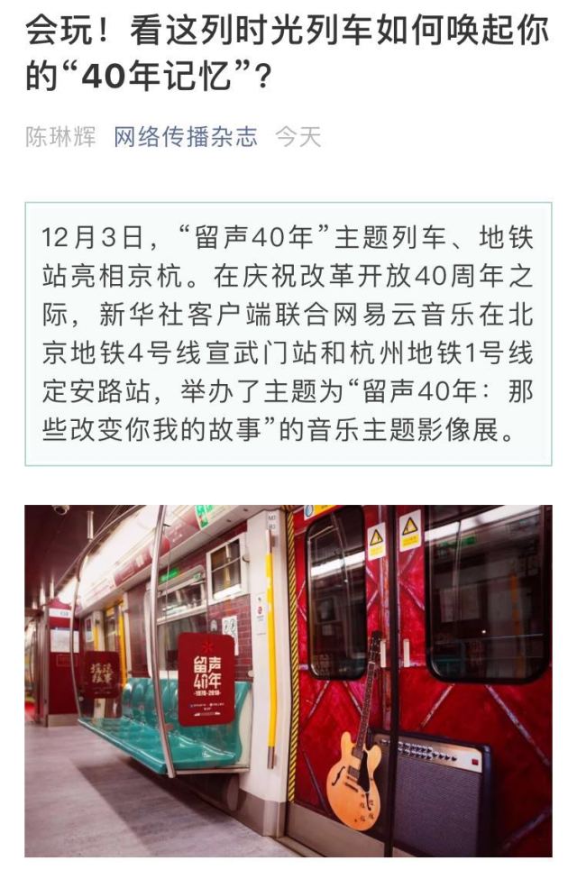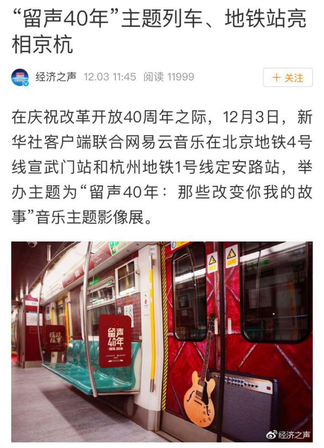 新華社北京12月4日電(記者 牧小湘)為慶祝改革開放40周年,新華社客戶端與網(wǎng)易云音樂、京港地鐵聯(lián)合舉辦的“留聲40年:那些改變你我的故事”音樂主題影像展12月3日亮相北京地鐵4號線宣武門站及杭州地鐵1號線定安路站。
