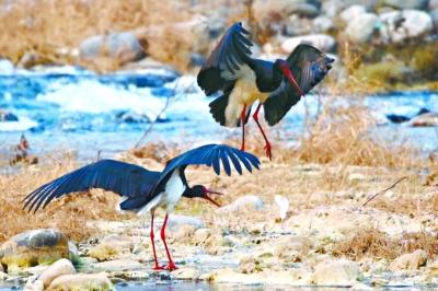 這幾天驟然降溫,為了不讓黑鸛挨餓,楊樹林酒店每天傍晚都會派人在淺灘里投放泥鰍,“有食吃,黑鸛來得更勤了,昨天來了15只,今早來了17只。”劉紅霞說。