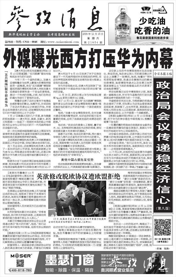 《參考消息》頭版報道改革開放40周年紀念大會 彩版