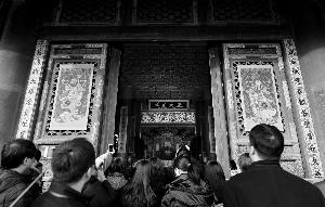 此次展覽從臘月初一展至三月初三,為期三個(gè)月,分為文物展覽和實(shí)景體驗(yàn)兩部分。文物展覽位于午門正殿和東西雁翅樓展廳,共展出文物885件(套)。實(shí)景體驗(yàn)部分包括整個(gè)紫禁城開放區(qū)域,都成為春節(jié)文化的展場,在宮殿門口會懸掛著寓意吉祥的春聯(lián)、門神(上圖),在廊廡下裝飾著華美的宮燈,在乾清宮的丹陛上下豎立著高大的天燈、萬壽燈,總共使用仿制品超過1000件。
