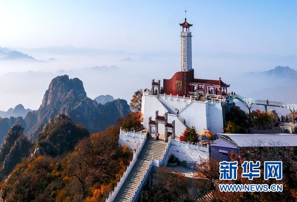 這是狼牙山棋盤陀峰頂的“狼牙山五勇士紀念塔”(2017年10月27日無人機拍攝)。 新華社發