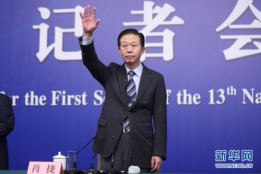 十三屆全國人大一次會議新聞中心于3月7日上午在梅地亞中心多功能廳舉行記者會,邀請財政部部長肖捷,副部長史耀斌、胡靜林就“財稅改革和財政工作”相關(guān)問題回答中外記者提問。圖為財政部部長肖捷向記者舉手示意。新華網(wǎng)/中國政府網(wǎng) 翟子赫 攝