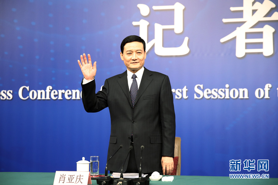 十三屆全國(guó)人大一次會(huì)議新聞中心3月10日15時(shí)在梅地亞中心多功能廳舉行記者會(huì),邀請(qǐng)國(guó)務(wù)院國(guó)資委主任肖亞慶,副秘書(shū)長(zhǎng)、新聞發(fā)言人彭華崗就“國(guó)有企業(yè)改革發(fā)展”相關(guān)問(wèn)題回答中外記者提問(wèn)。圖為肖亞慶向記者示意。新華網(wǎng)/中國(guó)政府網(wǎng) 翟子赫 攝