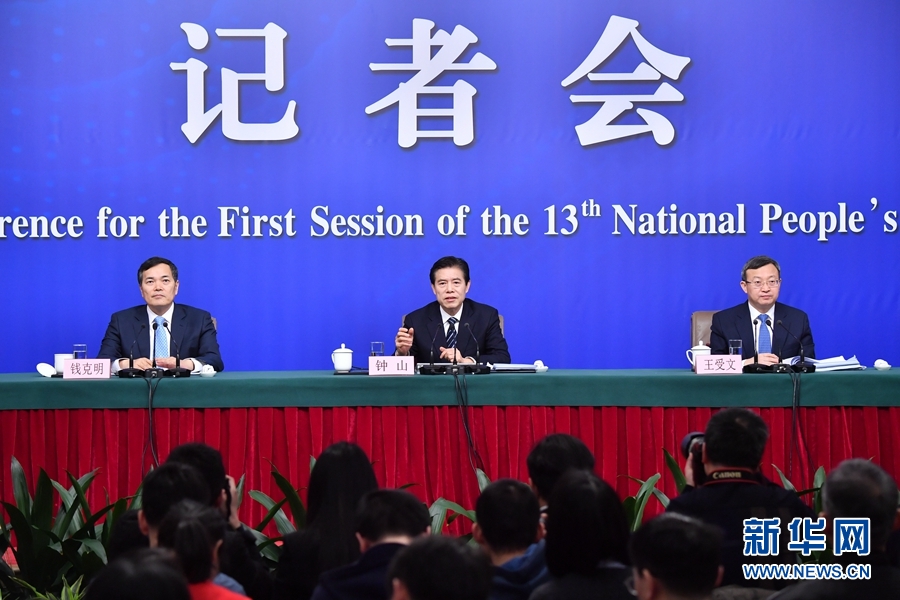 3月11日,十三屆全國(guó)人大一次會(huì)議新聞中心舉行記者會(huì),邀請(qǐng)商務(wù)部部長(zhǎng)鐘山、副部長(zhǎng)兼國(guó)際貿(mào)易談判副代表王受文、副部長(zhǎng)錢克明就“推動(dòng)形成全面開放新格局推動(dòng)商務(wù)事業(yè)高質(zhì)量發(fā)展”相關(guān)問題回答中外記者提問。 新華社記者 李鑫 攝
